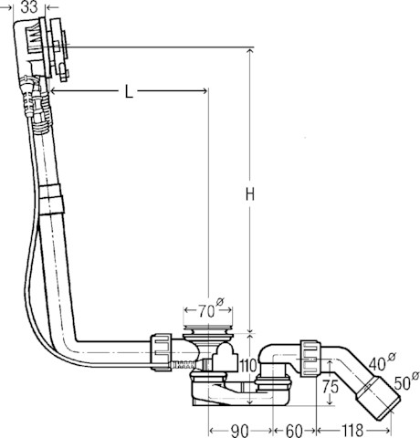 Multiplex Trio-komplet odpływowo-przelewowy jednostka funkcyjna nr wzoru 6161.52 DN: 40/50 długość cięgna Bowdena: 560 L: 100–260 H: 180–400 wanna standardowa do wanien z otworem odpływowym fi 52