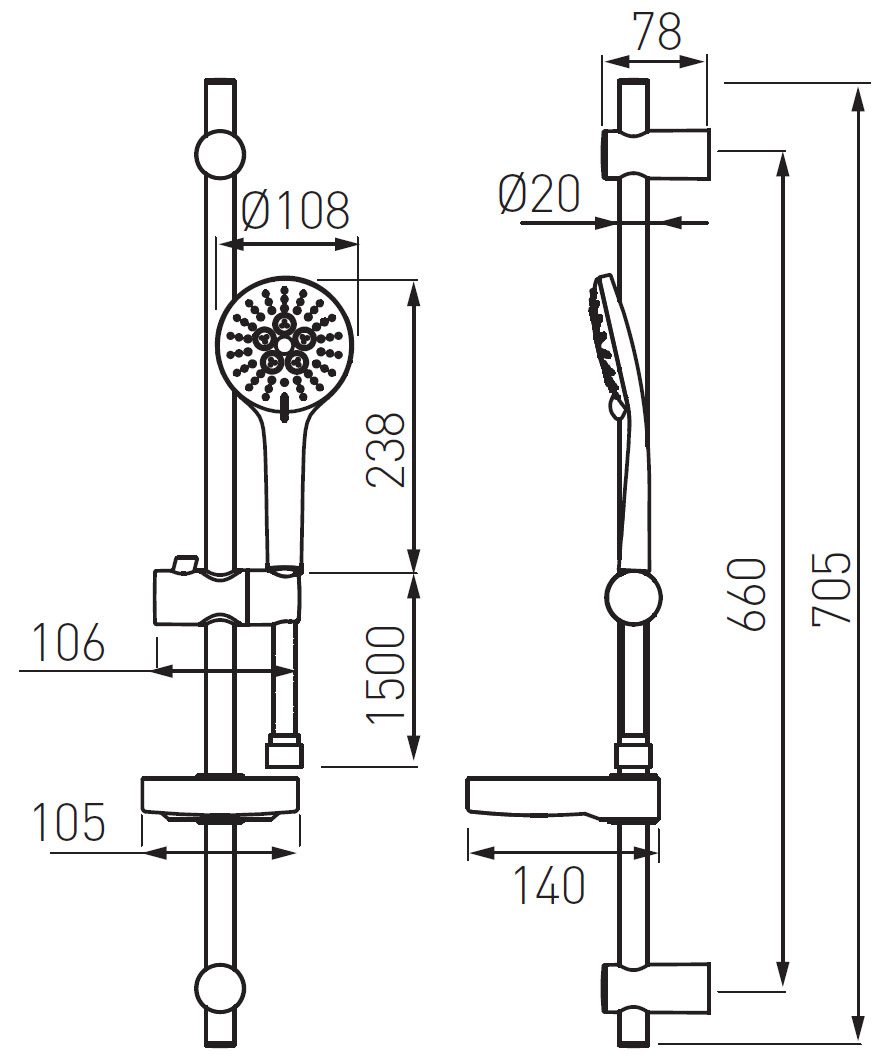 Zestaw natryskowy z 3-funkcyjną, okrągłą rączka natryskowa z możliwością wyboru typu strumienia. Praktyczna mydelniczka w komplecie. Regulacja rozstawu uchwytów mocujących, daje nam możliwość dopasowania zestawu do istniejących otworów montażowych po starym natrysku.