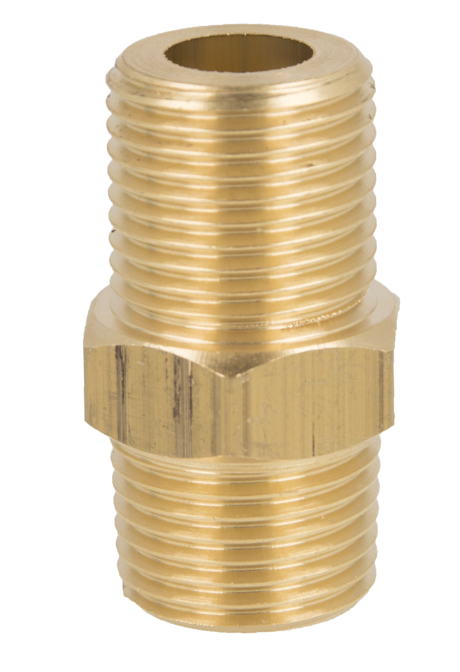 Nypel mosiężny 1/2" do połączenia kurków manometrycznych AMC z dwoma nakrętkami z instalacją.