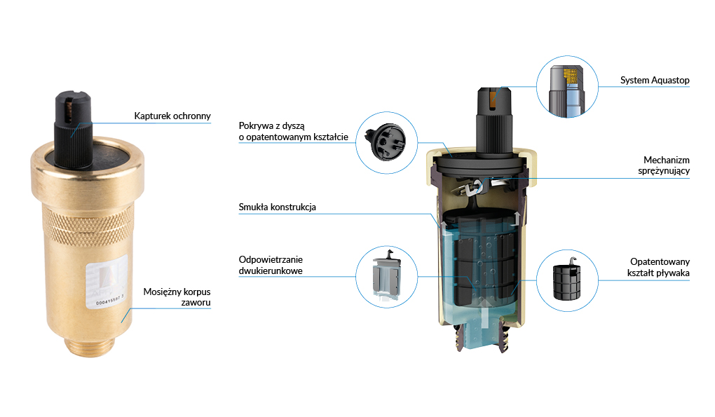 Opcjonalnie można wyposażyć go w zawór stopowy, który umożliwia łatwą wymianę i konserwację odpowietrznika bez konieczności spuszczania medium z instalacji.