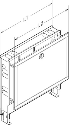 Podtynkowa szafka rozdzielacza, głębokość montażu 80–110 mm. Przeznaczenie: ogrzewanie powierzchniowe Fonterra. Zastosowanie: rozdzielacz obwodów grzejnych DN25 nr wzoru 1010, blacha stalowa ognioodporna/biały drogowy=RAL 9016, z regulacją wysokości od 675–855 mm, wysokość ramy 547 mm. Wyposażenie: Rama i drzwi, zdejmowana zaślepka otworów przyłączeniowych do bezpiecznego prowadzenia rur w obszarze przyłączeniowym, wspornik uniwersalny do rozdzielacza obwodów grzejnych. Wskazówka: W przypadku korzystania z jednostki bazowej Fonterra Smart Control CO w połączeniu ze skrzynką przekaźnikową Fonterra Smart Control, co najmniej skrzynka rozdzielcza typu 560 (do maks. 5 obiegów rozdzielacza)! Od 6 obiegów należy wybrać typ 700!, nr wzoru 1294.3, nr kat. 692 193, Typ: 700 L1: 685 L2: 745 przyłącze rozdzielacza poziomo: ≤10 przyłącze rozdzielacza górne: ≤7 przyłącze rozdzielacza + zawór strefowy poziomy: ≤9