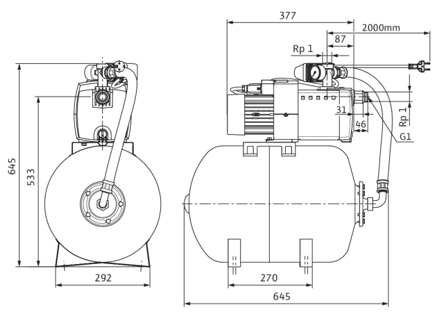 Fabrycznie zamontowana i okablowana jednostka, złożona z wielostopniowej, poziomej pompy wirowej w wersji dławnicowej, bez funkcji samozasysania, z silnikiem z bezpośrednim przyłączem kołnierzowym (uszczelnienie przepustu wałowego w postaci niewymagającego konserwacji uszczelnienia mechanicznego) oraz z ciśnieniowym naczyniem przeponowym