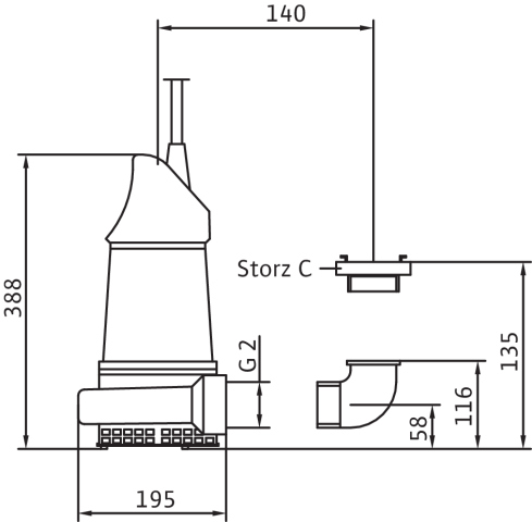 Całkowicie zanurzona pompa zatapialna do wody zanieczyszczonej, pionowe ustawienie mokre, do tłoczenia wody zanieczyszczonej i zawierającej piasek Korpus hydrauliczny i wirnik z żeliwa szarego, korpus silnika z aluminium. Przyłącze tłoczne z pionowym odpływem ciśnieniowym i złączem typu Storz. Samochłodzący silnik w wersji na prąd trójfazowy, z odłączanym kablem zasilającym i wtyczką wg standardu CEE z funkcją zamiany faz. Do uszczelnienia po stronie medium i silnika służy uszczelnienie mechaniczne. Agregat można stosować w podsysającym trybie pracy bez ograniczeń.