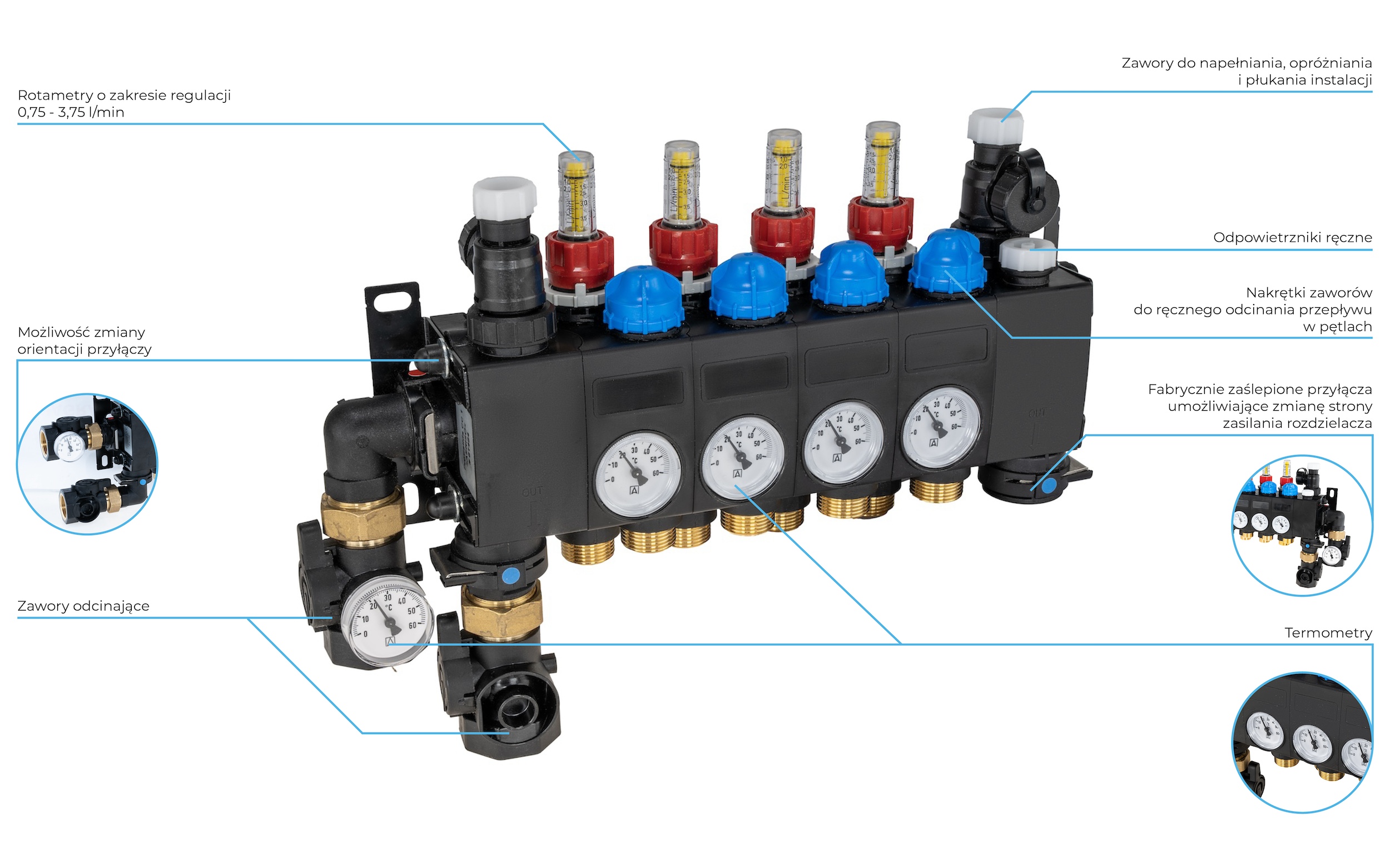Poliamidowe zawory odcinające ułatwiają pracę konserwacyjne oraz napełnianie oraz płukanie pętli. Zawór na zasilaniu posiada termometr.