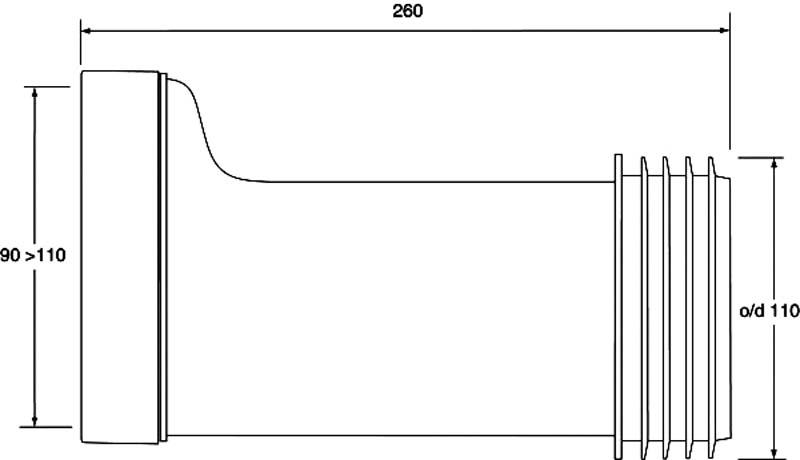 Przyłącze kanalizacyjne długie, L-350mm. Mimośrodowe przesunięcie 20mm. Wejście 90-110mm z uszczelką wargową, wyjście 110mm z uszczelką kołnierzową.