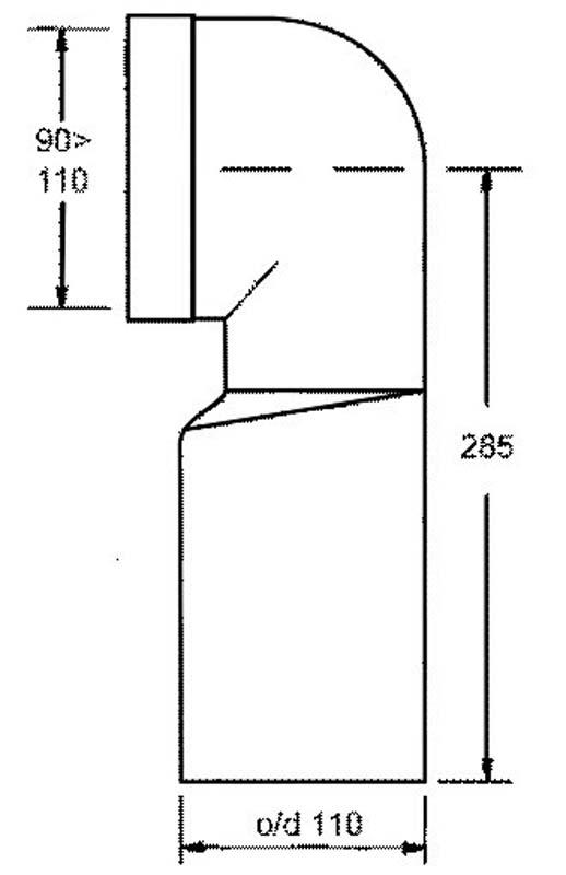 Przyłącze kanalizacyjne długie, L-285mm. Kąt 90 stopni. Wejście 90-110mm z uszczelką wargową, wyjście 110mm.