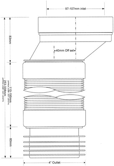 Przyłącze kanalizacyjne elastyczne z przesunięciem 40mm, o długości od 253 do 338mm. Wejście 90-110mm z uszczelką wargową, wyjście 110mm z uszczelką kołnierzową.