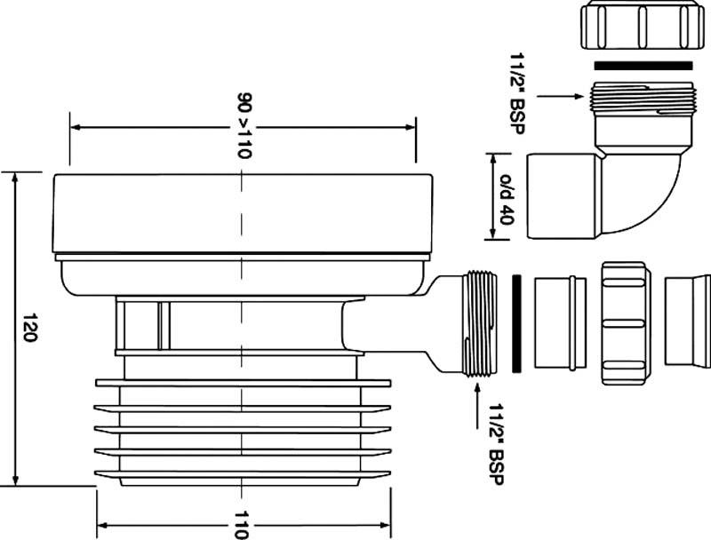 Przyłącze kanalizacyjne krótkie, proste L-120mm.Z odejściem 40mm. Wejście 90-110mm z uszczelką wargową, wyjście 110mm z uszczelką kołnierzową.