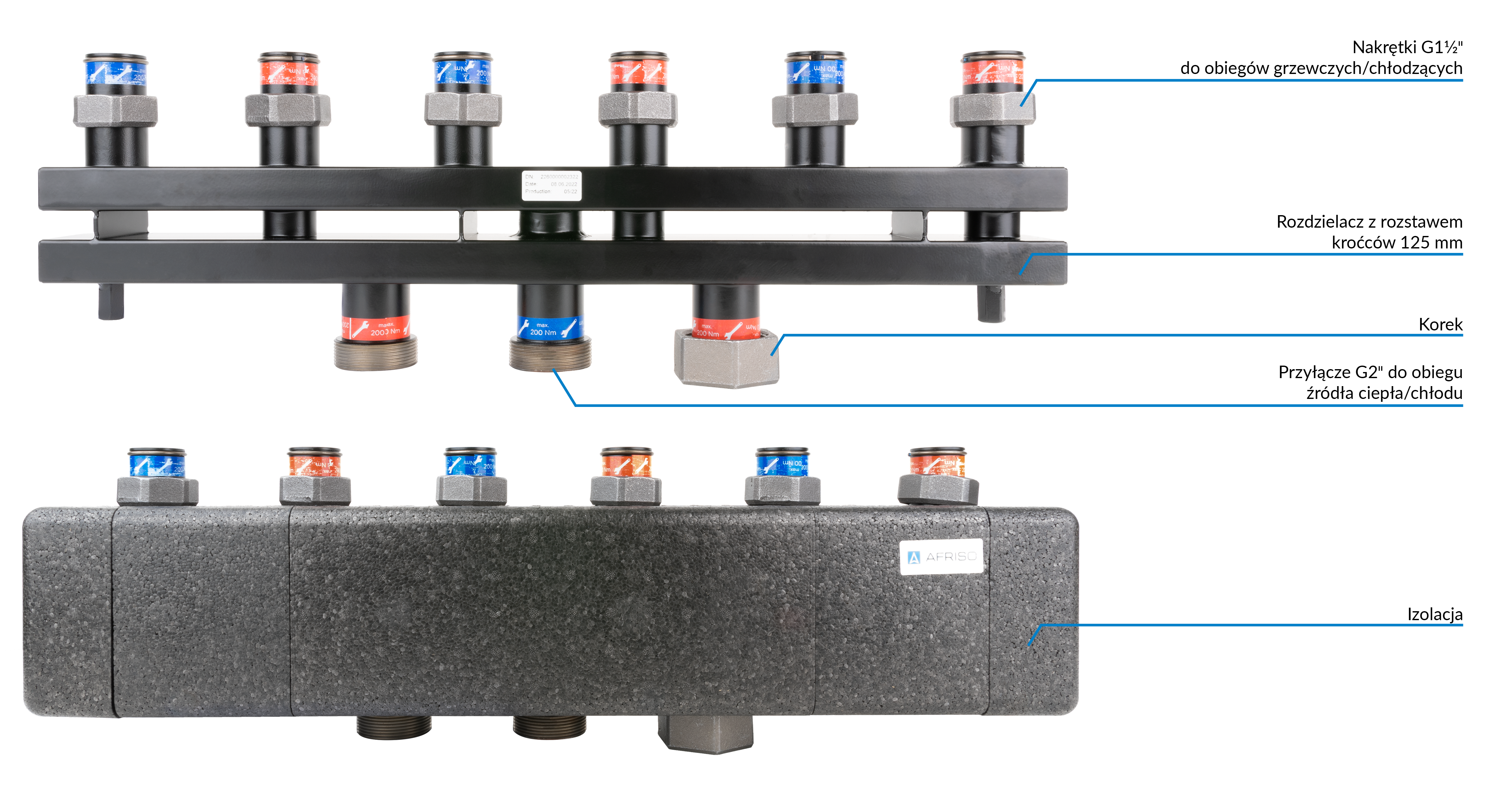 Rozdzielacz do instalacji c.o. AFRISO KSV 125-3 GZ 2'', 3-obieg. Nakrętka 1 1/2'', max. 160 kW