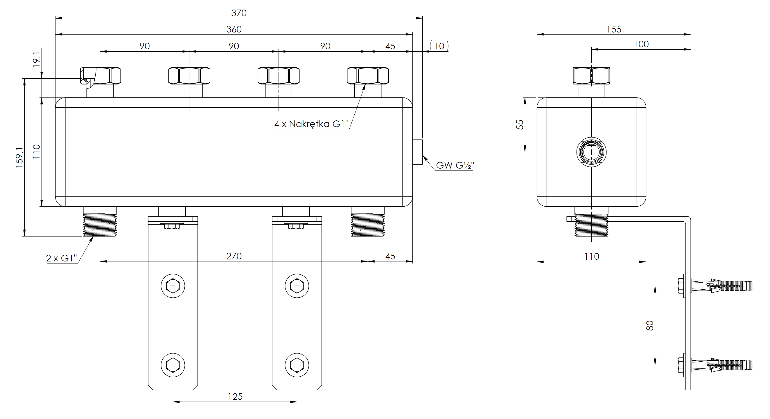 Przyłącze boczne GW G1/2" umozliwia wkręcenie tulei na czujnik temperatury.