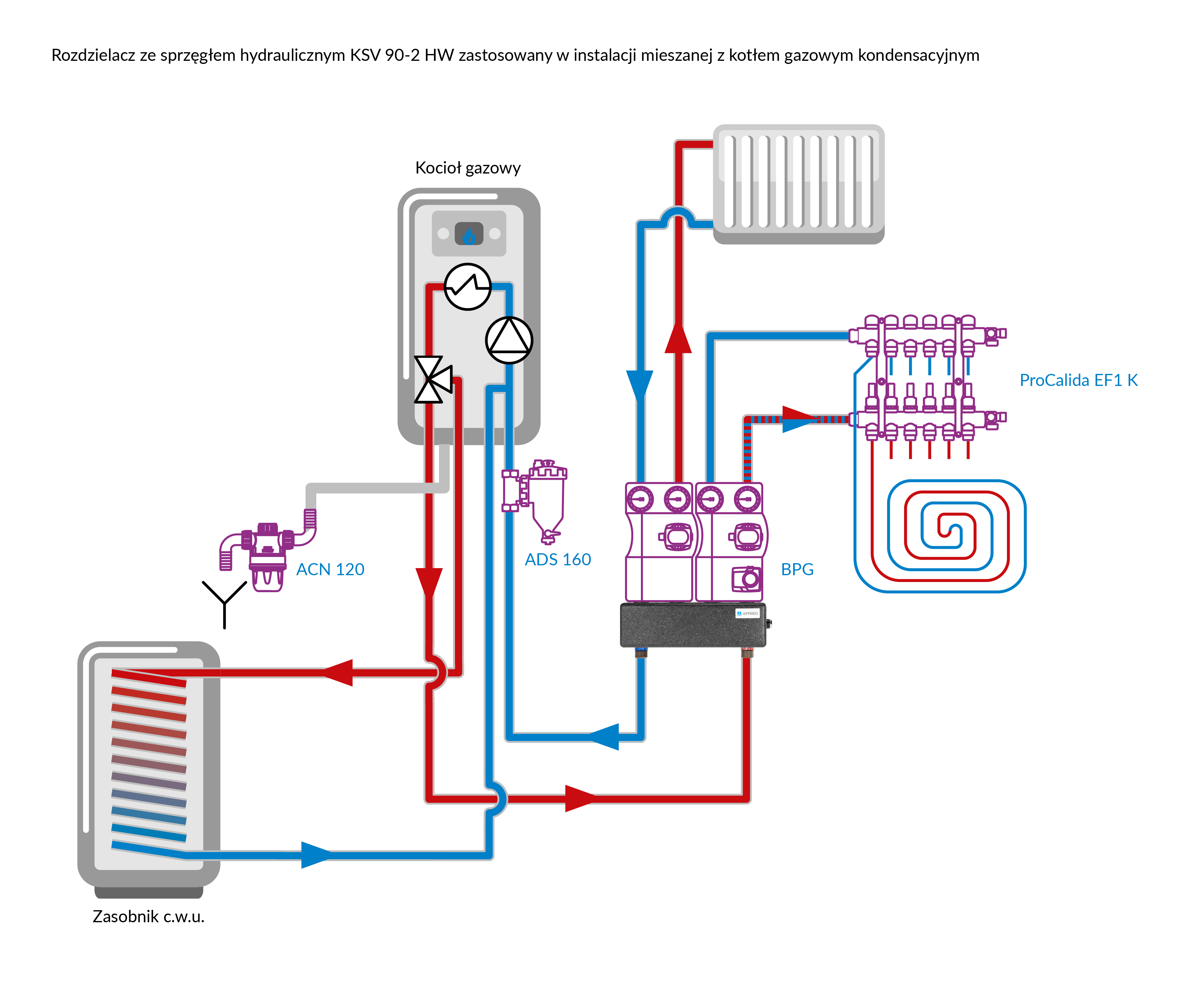 Stosowany w instalacjach grzewczych i chłodzących.Montowany na ścianie pomiędzy źródłem ciepła lub chłodu a grupami pompowymi.