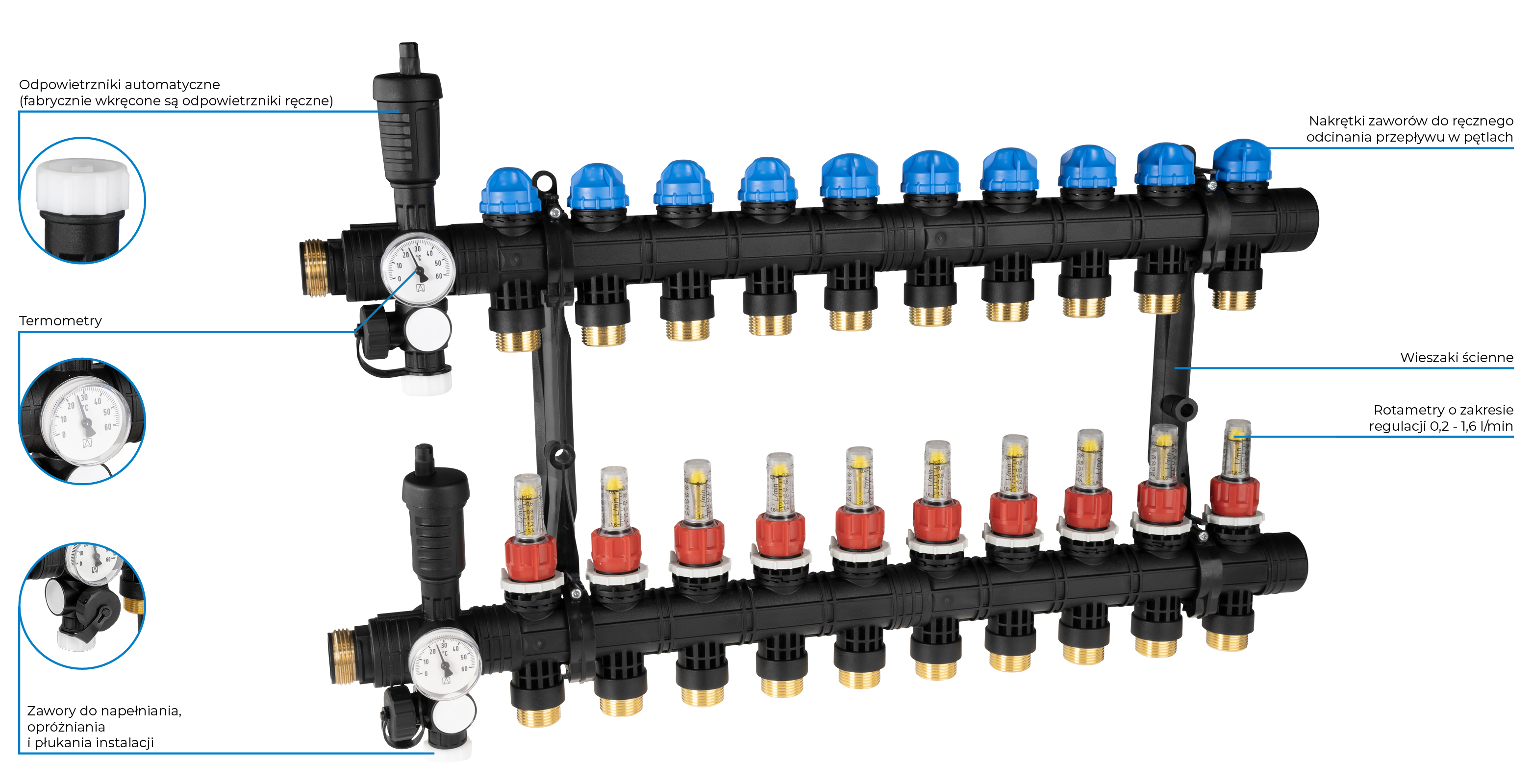 Rozprowadza ciepło/chłód ze źródła na poszczególne pętle instalacji płaszczyznowej.