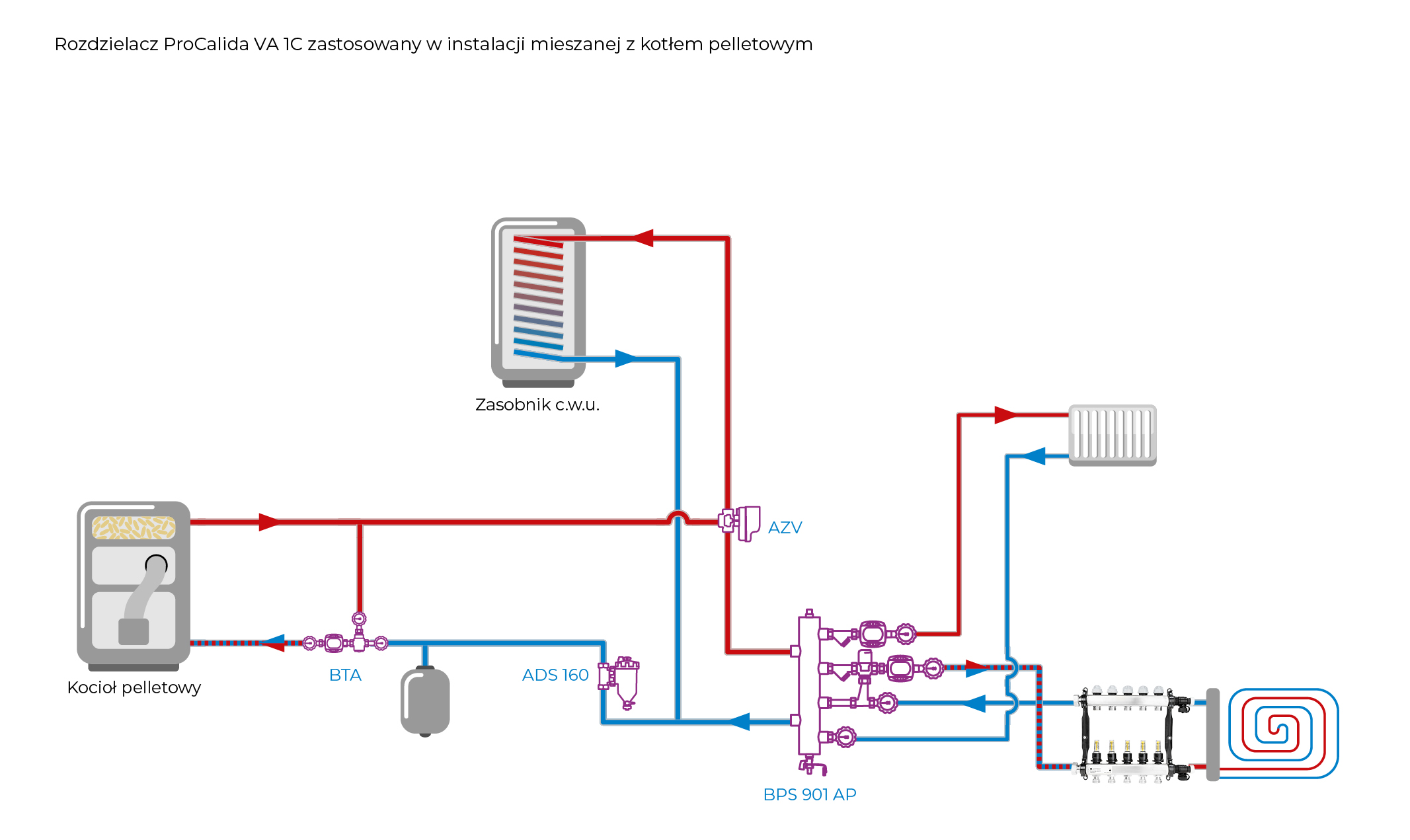 Rozprowadza ciepło/chłód ze źródła na poszczególne pętle instalacji płaszczyznowej.