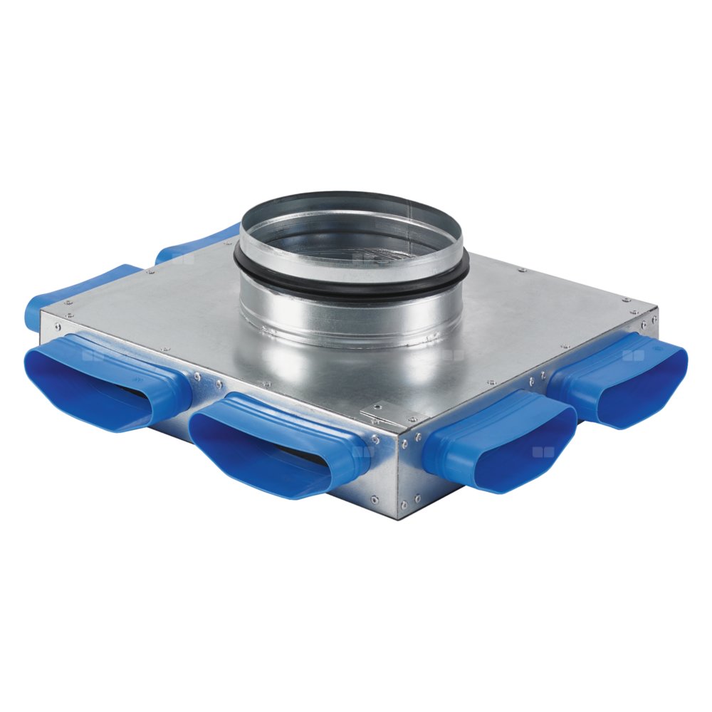 Rozdzielacz pow. z 6 wyjściami do podłączenia płaskiego kanału LVE RP 20 i jednym dolnym przyłączem głównym DN 160. Zewn. stal ocynkowana, wew. izolacja akustyczna. Szerokość 315 mm, długość 315 mm, wysokość 56 mm