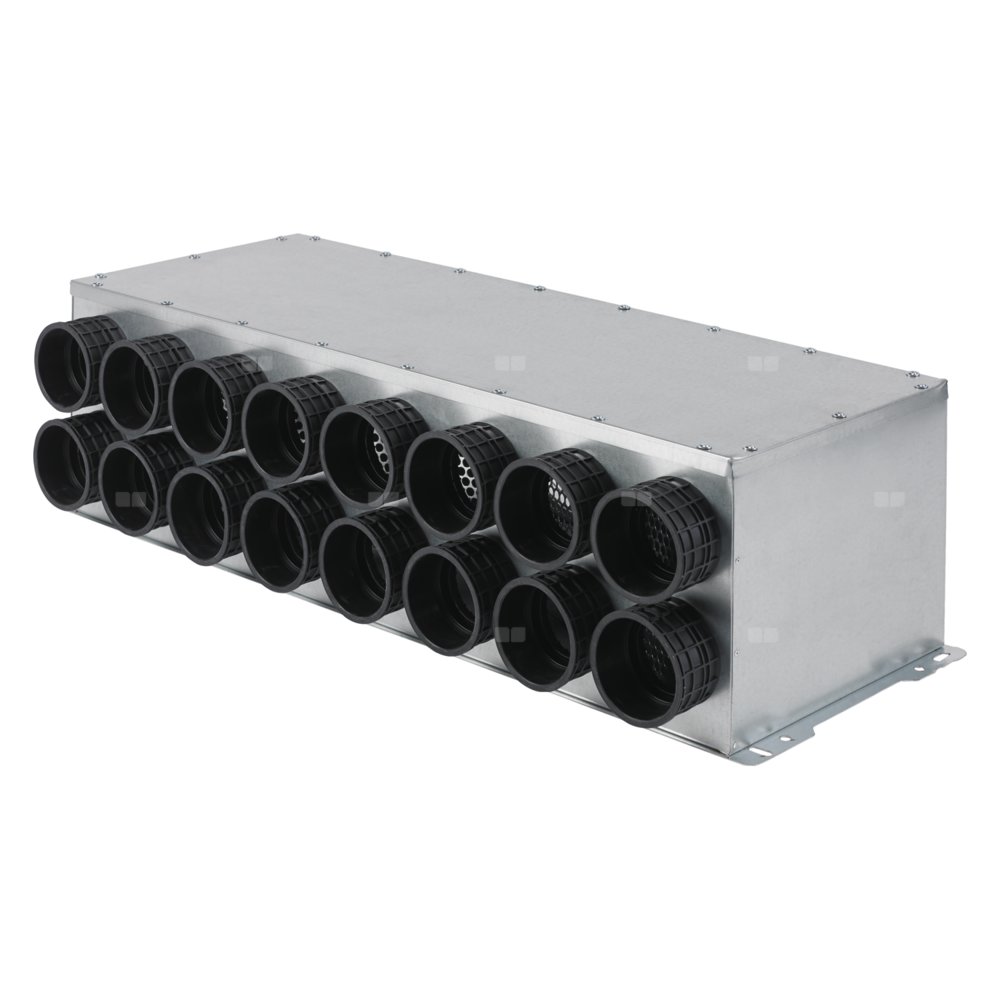 Rozdzielacz powietrza dwurzędowy z stali ocynkowanej z wewnętrzną izolocją akustyczną dla 16 x fi75. Boczny króćciec przyłączeniowy DN 200, Rozdzielacz posiada perforacje oraz dostęp rewizyjny