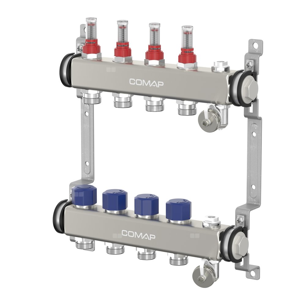 • Specjalnie zaprojektowany do ogrzewania i chłodzenia powierzchniowego. Kompaktowy rozdzielacz ze stali nierdzewnej reguluje dopływ i odpływ wody ze źródła i rozdziela wodę w sposób jednorodny. Każdy obwód jest indywidualnie zrównoważony hydraulicznie. Komponenty