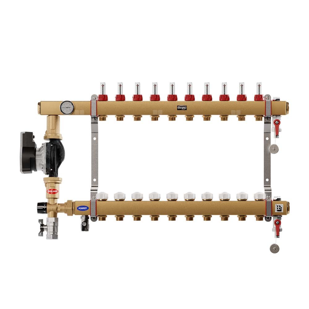 Wysokość: 450 mm, Szerokość: 780 mm, Głębokość: 95 mm, Ilość sekcji: 10, Układ wyposażony w pompę energooszczędną, Rozdzielacz stalowy z zaworem trójdrożnym (20-40oC) i pompowym układem mieszania do ogrzewania podłogowego w układzie zamkniętym.