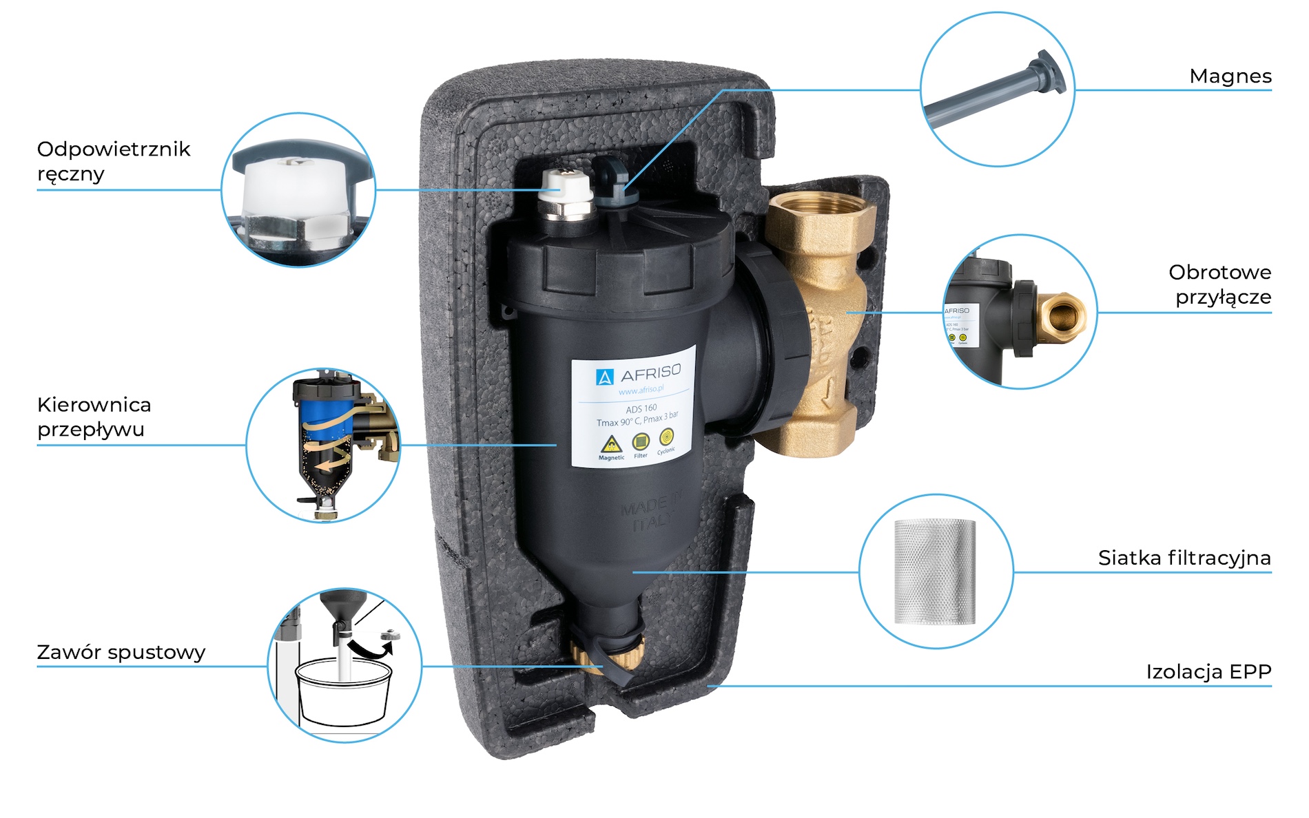 Separator AFRISO ADS 160, do C.O., do klimatyzacji, 3 bar / 90'C, 1'' (GW), z wkładem magnesowymInstalacje i źródła ciepła, z izolacją