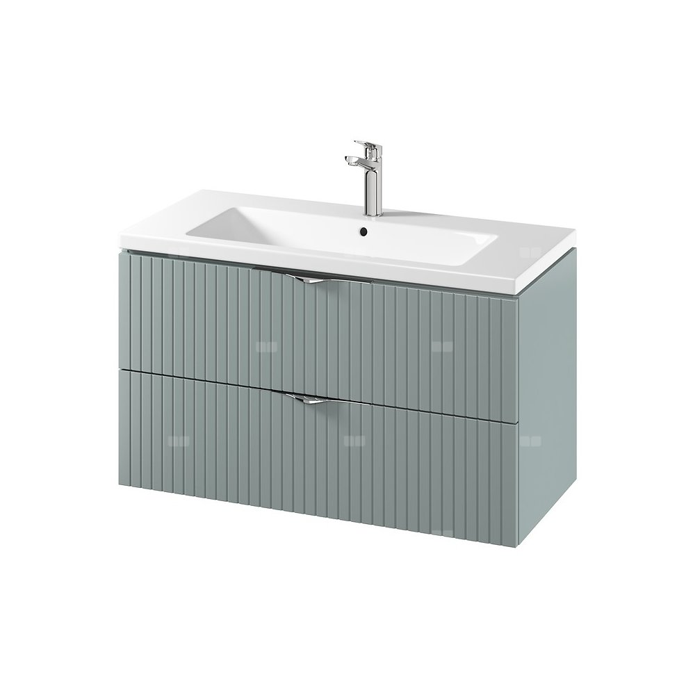 W skład zestawu wchodzi szafka podumywalkowa TIRSO 100 w wersji DSM oraz umywalka ceramiczna COMO 100. Szafka wyposażona w dwie pojemne szuflady z pełnym dnem, zapewniające więcej miejsca do przechowywania różnych akcesoriów łazienkowych - w związku z tym rekomendujemy zastosowanie syfonu oszczędzającego miejsce. Front szafki wykonany jest z ryflowanej płyty MDF foliowanej w matowej wersji, co nadaje jej subtelną fakturę i elegancki wygląd. Korpus szafki to płyta wiórowa laminowana, również w matowym wykończeniu. Prostokątna umywalka ceramiczna COMO 100 posiada otwór na armaturę i przelew w centralnej części, moze być skompletowana z korkami klik-klak ceramicznymi lub metalowymi z oferty Cersanit.