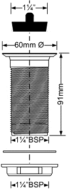 Spust umywalkowy 1.1/4″x91x60mm z korkiem gumowym, bez otworu przelewowego.