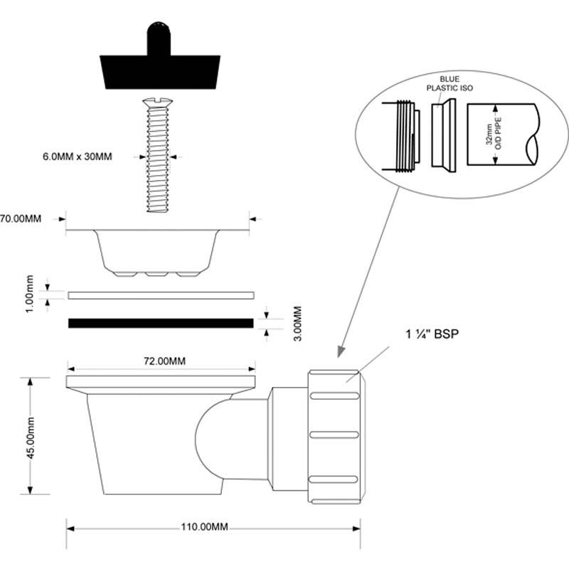 Spust umywalkowy 32mm'x70mm z sitkiem ze stali nierdzewnej oraz korkiem gumowym.