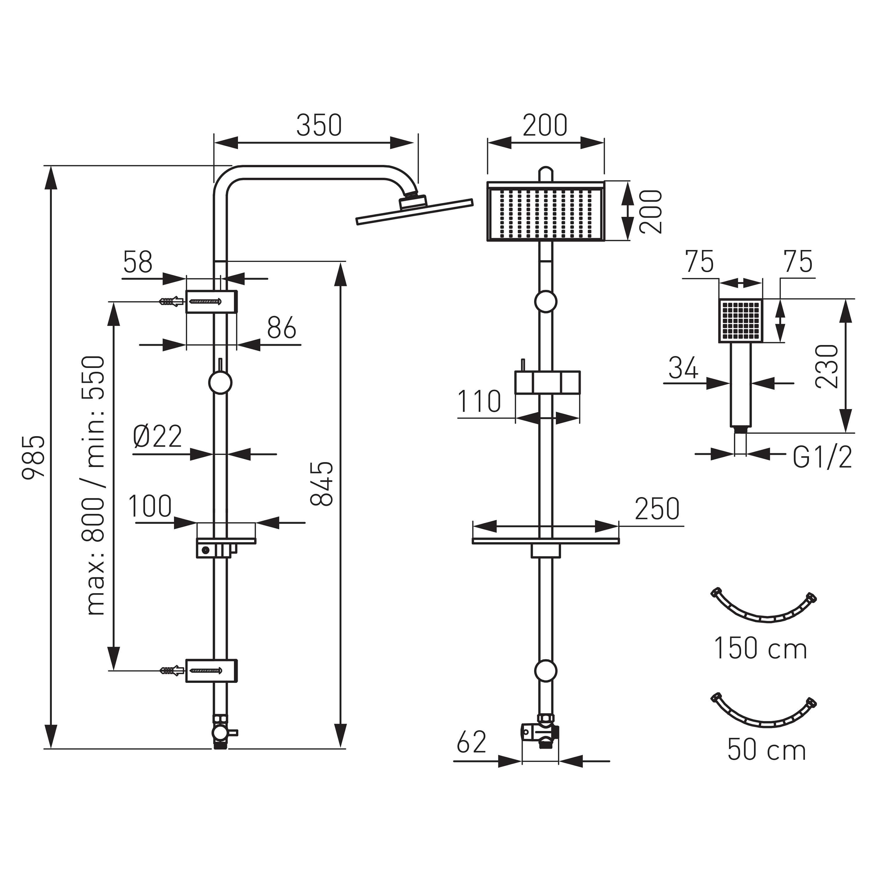 SQUERTO LUX BLACK zestaw natryskowy z deszczownią, czarny