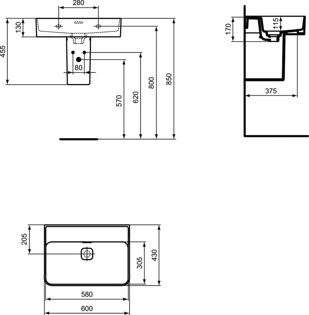 Umywalka Strada II bez otworu na baterię, z przelewem o szczelinowym kształcie oraz korkiem o białej pokrywie. Do montażu z meblami, półpostumentem T299601 lub samodzielnie z syfonem. Opcjonalny montaż z korkiem typu Click-clack z metalową pokrywą T3629AA. Zalecane wyposażenie: zestaw montażowy M10 x 140 mm.