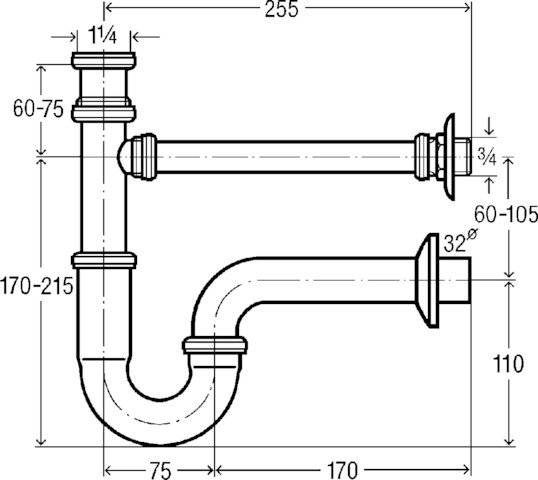 Syfon rurowy, mosiądz chrom.. Wyposażenie: Dwuzłączka regulowana, przyłącze odprowadzające wodę ze skroplin, rura regulowana 160 mm, łuk odpływowy 170 mm, wg PN-EN 274, nr wzoru 5611.02, nr kat. 109 950, G: 1¼ DN: 32