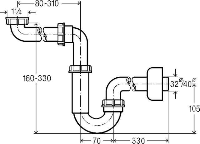 Syfon rurowy tworzywo sztuczne, z możliwością pozyskania dodatkowej przestrzeni, nr wzoru 5729 G: 1¼ DN: 32