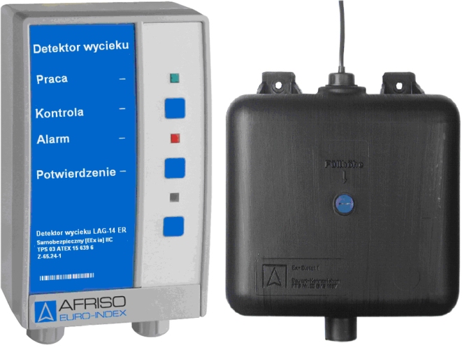 Zbiornik urządzenia LAG-14 ER na ciecz detekcyjną z sondą może być montowany w strefie I lub II zagrożenia wybuchem Ex.
