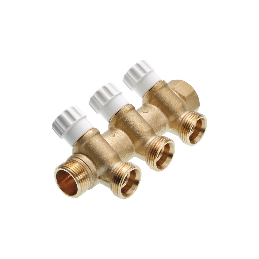TECE rozdzielacz mosiężny z zaworami odcinającymi. Belka GW / GZ średnicy 1" lub 3/4". Wyjście sekcji wody 3/4" pod Eurokonus.