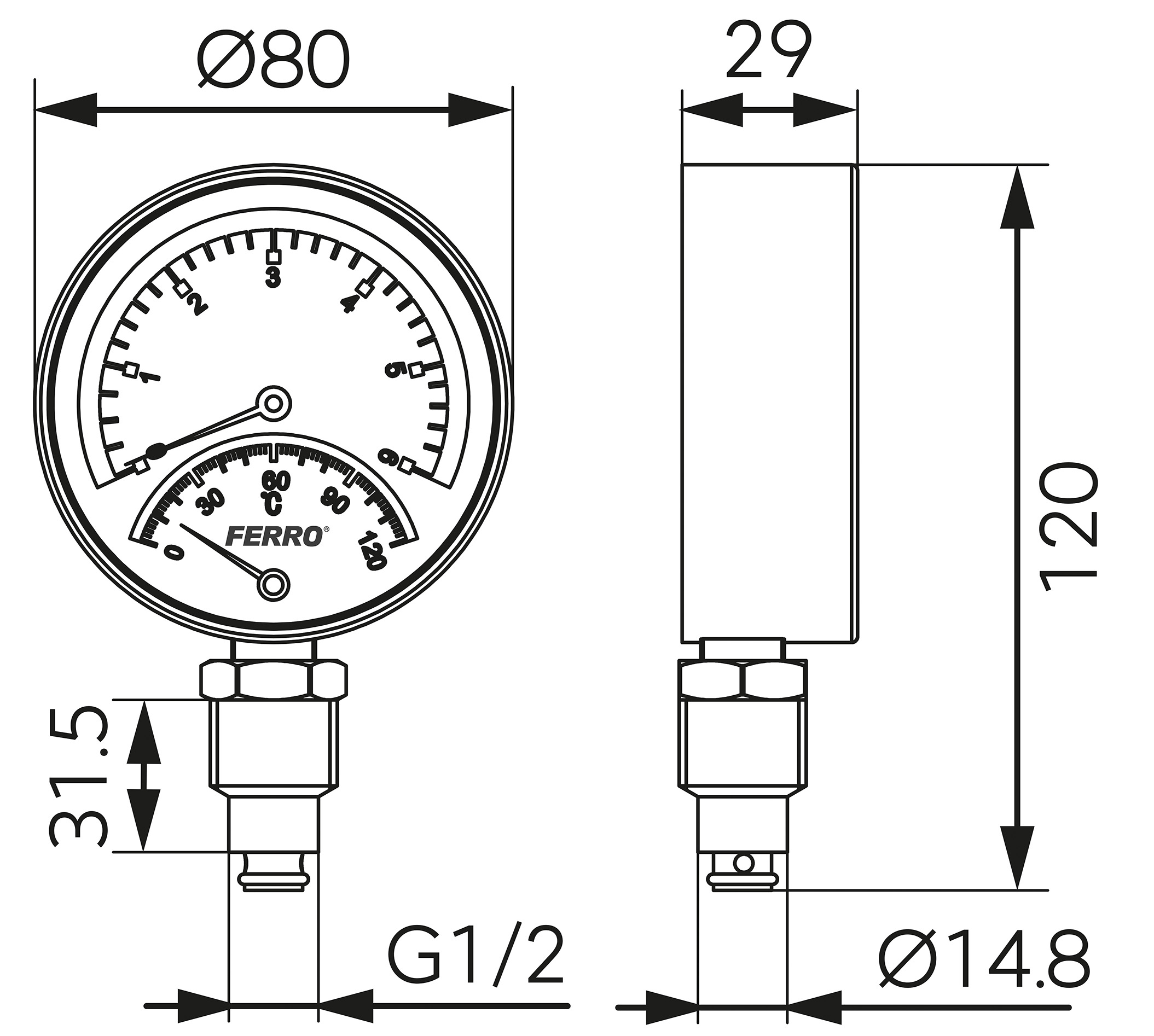 Termometr bimetaliczny FERRO fi 80 mm 120'C 6 bar połączenie radialny
