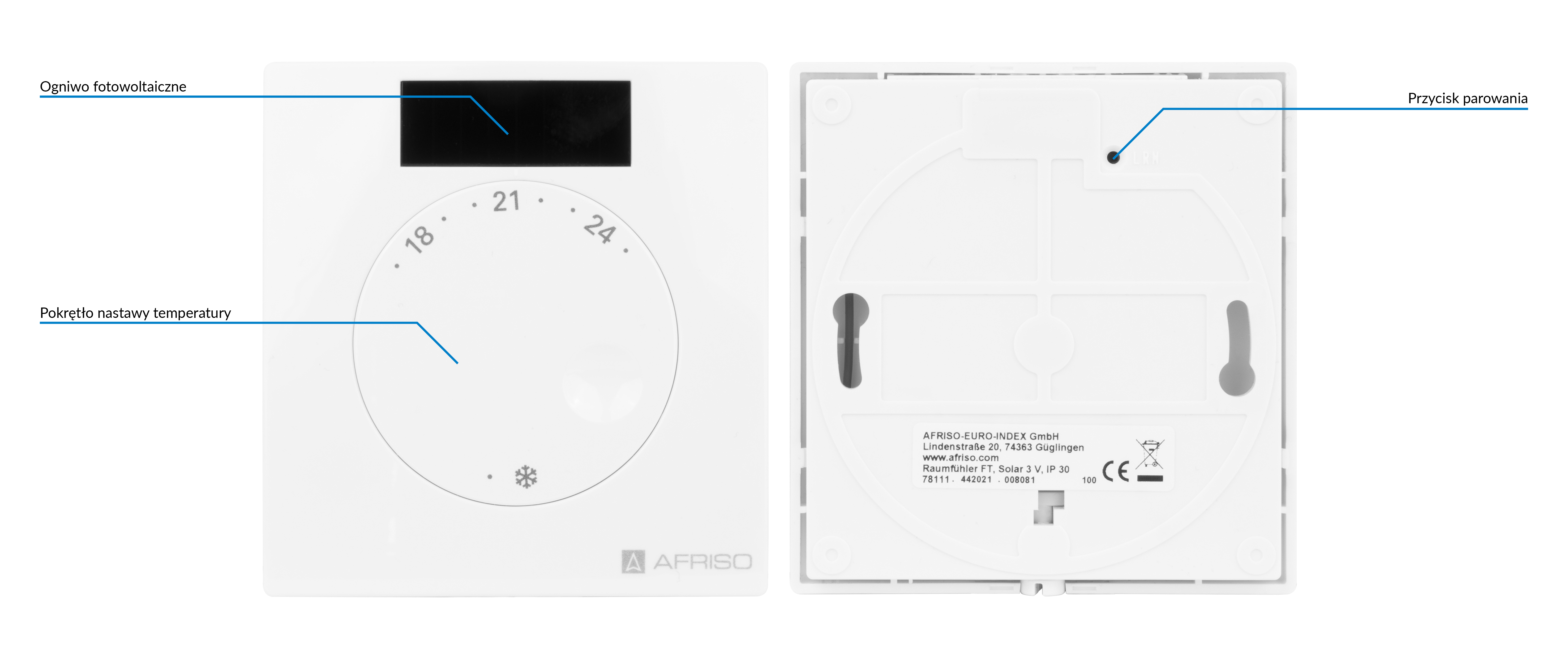 Zasilanie ogniwem fotowoltaicznym (wbudowanym w termostat) albo baterią 3 V DC (brak w elementach dostawy).