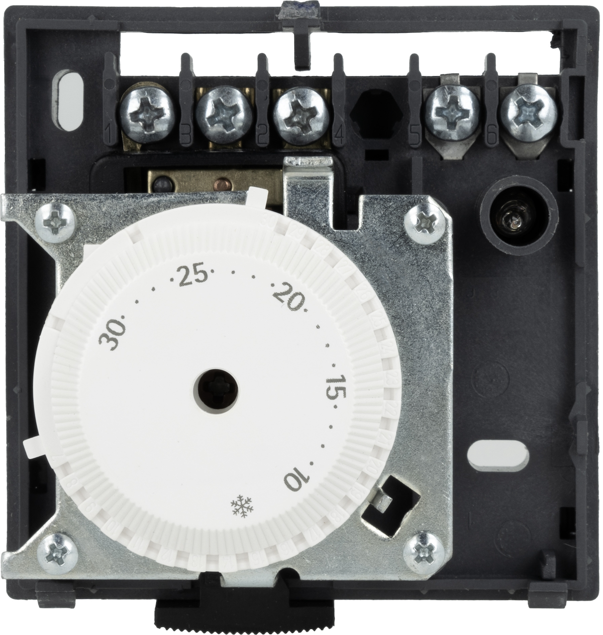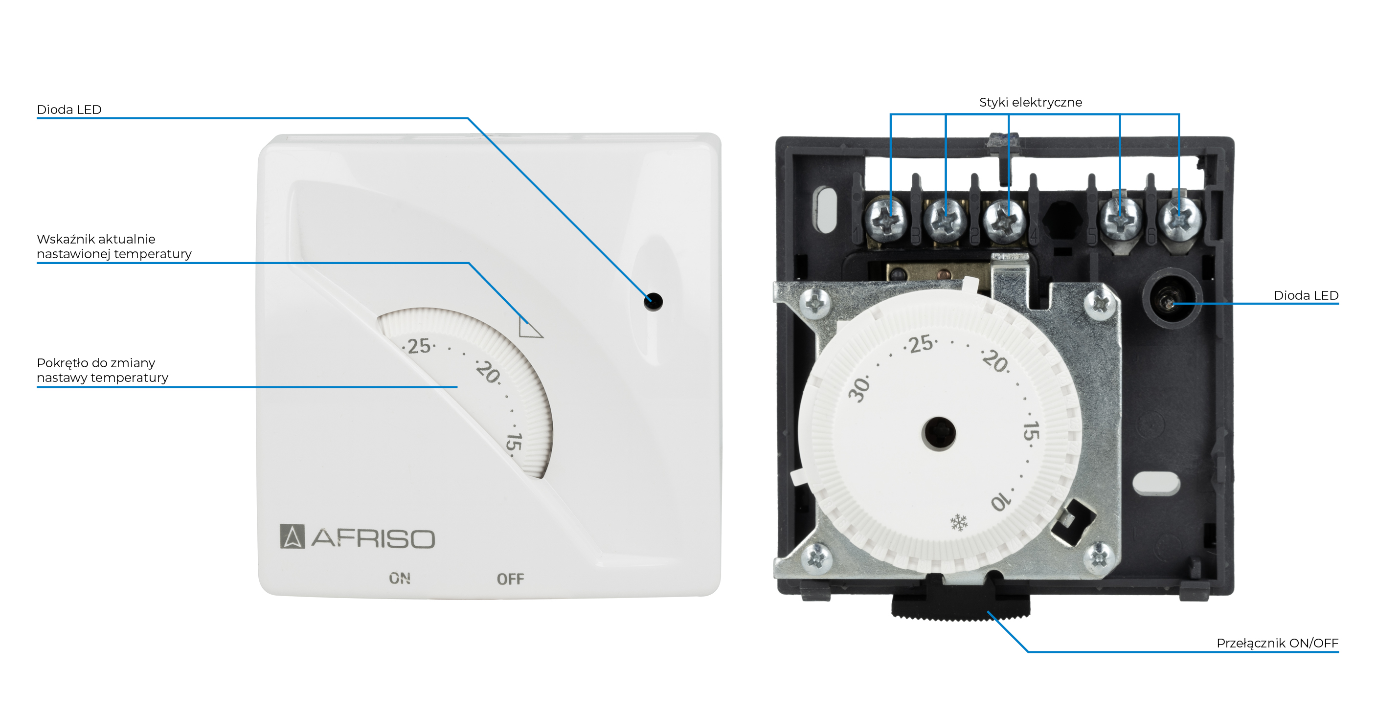 Włącza lub wyłącza sterowane urządzenie w zależności od temperatury zmierzonej w pomieszczeniu i nastawionej na pokrętle.