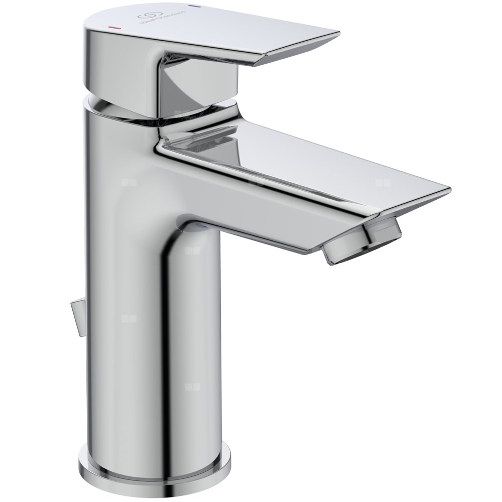 Bateria umywalkowa Tesi z metalowym automatycznym korkiem. Głowica ceramiczna IS 28 mm z ogranicznikiem temperatury. Mosiężny, odlewany korpus. Metalowy uchwyt z nadrukowanymi czerwonymi i niebieskimi oznaczeniami. Perlator typu Cascade. Wężyki przyłączeniowe G3/8".