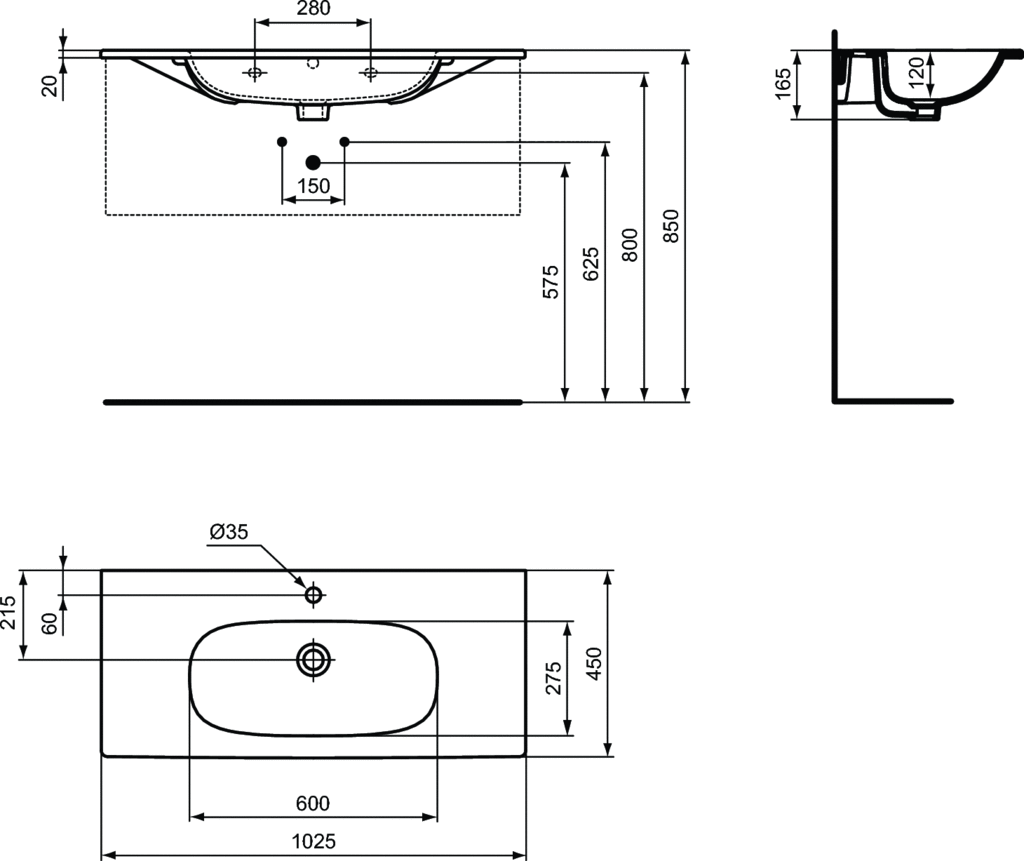 Umywalka Strada z powierzchniami bocznymi oraz centralnym otworem na baterię i przelewem. Do montażu z szafką pod umywalkę Tesi 100 cm lub samodzielnie z syfonem.