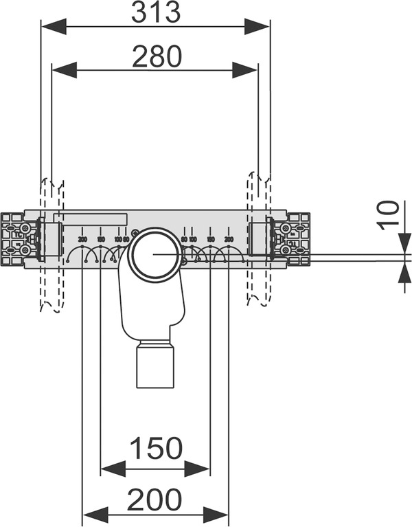Trawers ze stali ocynkowanej z izolacją akustyczną, do montażu kolan naściennych, z zamontowanym syfonem podtynkowym DN 50, wyjmowanym wkładem syfonu NW 30 (służącym jednocześnie jako uszczelka), zatyczką ochronną, materiałami mocującymi do montażu na kształtownikach TECEprofil, 2 x zaciski mocujące M 10 i mocowania umywalkowe.