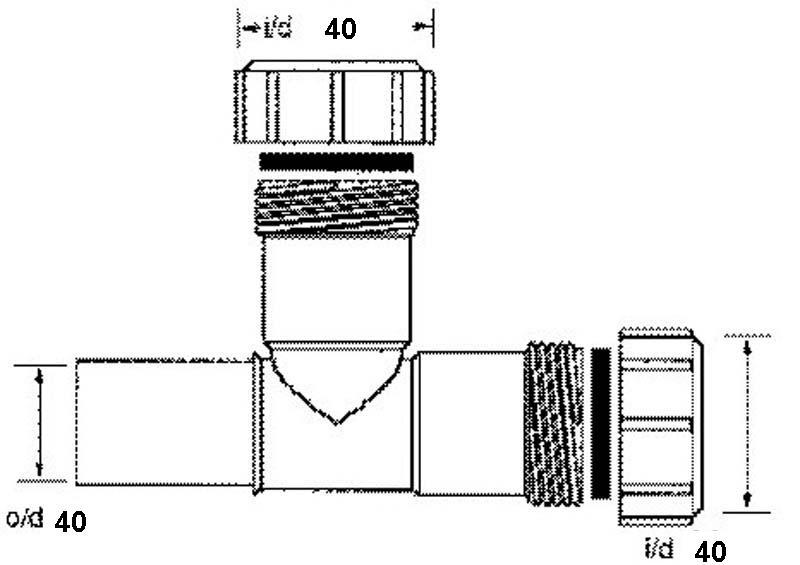 Trójnik nakrętno-prosty. Rozmiar 40x40x40mm.
