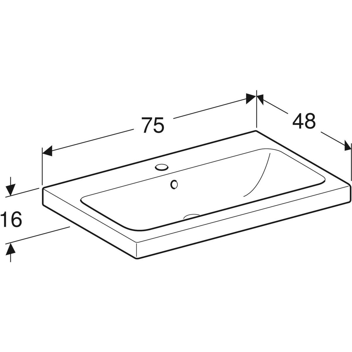 Umywalka GEBERIT iCon Light prostokątna, biała, 750mm, otwór na baterię na środku, stawiana na blat, z odpływem przelewowym, półka od ściany