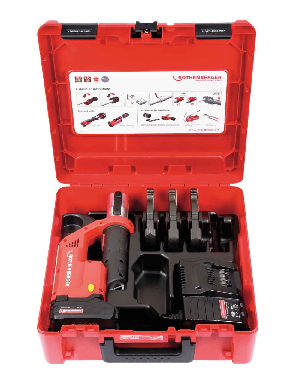 Instalatorzy z branż wodno-kanalizacyjnej i grzewczej używają elektrohydraulicznej zaciskarki ROMAX Compact TT do wykonywania instalacji domowych i usług serwisowych nawet w ciasnych przestrzeniach. ROMAX Compact TT wykorzystuje turbo ciśnienie do zaprasowywania metalowych kształtek do Ø 35 mm w zaledwie 3 sekundy. Ogromna moc przy zaledwie 34 cm długości dzięki dwucylindrowej konstrukcji i doskonale wyważony środek ciężkości ułatwiają długotrwałą pracę seryjną.