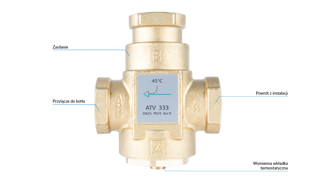 W instalacjach z kotłami stałopalnymi miesza lub rozdziela strumień medium. W przypadku funkcji mieszania ATV zabezpiecza kocioł przed korozją niskotemperaturową na skutek powrotu wody o zbyt niskiej temperaturze. W przypadku funkcji rozdzielania ATV rozdziela medium między powrotem do kotła a zasilaniem instalacji, umożliwiając wygrzanie kotła do odpowiedniej temperatury.