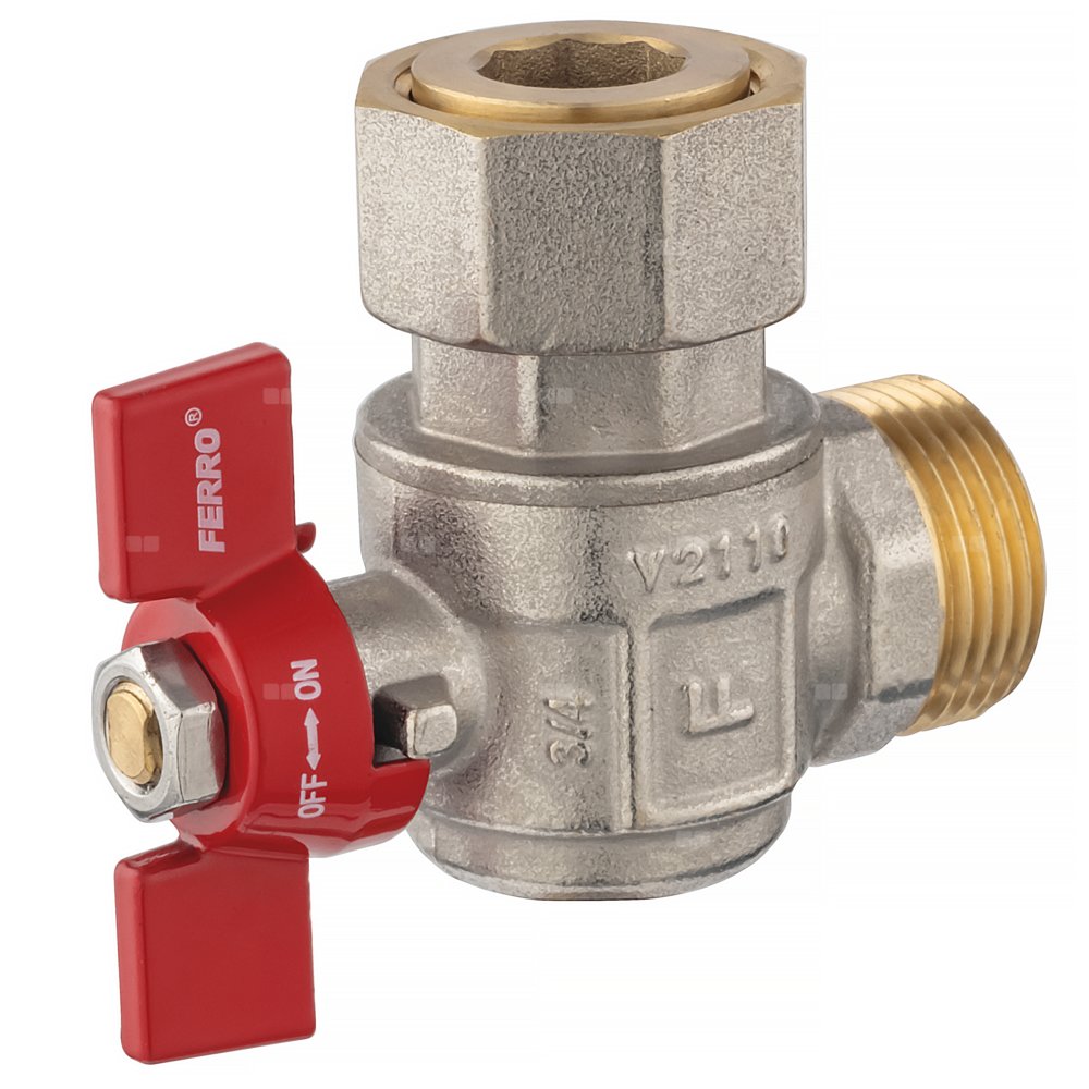Zawór kulowy kątowy z półśrubunkiem, nakrętno-wkrętny, z motylkiem, 3/4"