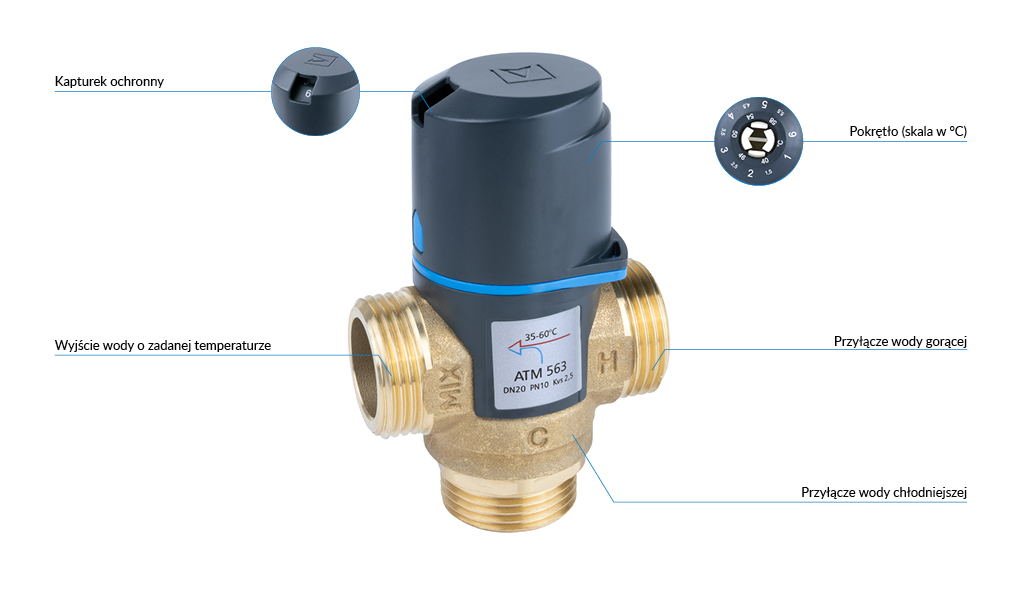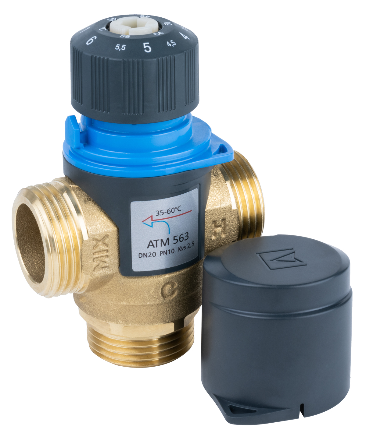 Zawór regulacyjny termostatyczny do wody ciepłej AFRISO ATM 563 mosiądz GZ 1'', DN 20, zakres temp. 35-60'C, Kvs 2.5 m3/h, maksymalna temperatura 90'C, maksymane ciśnienie 10 bar