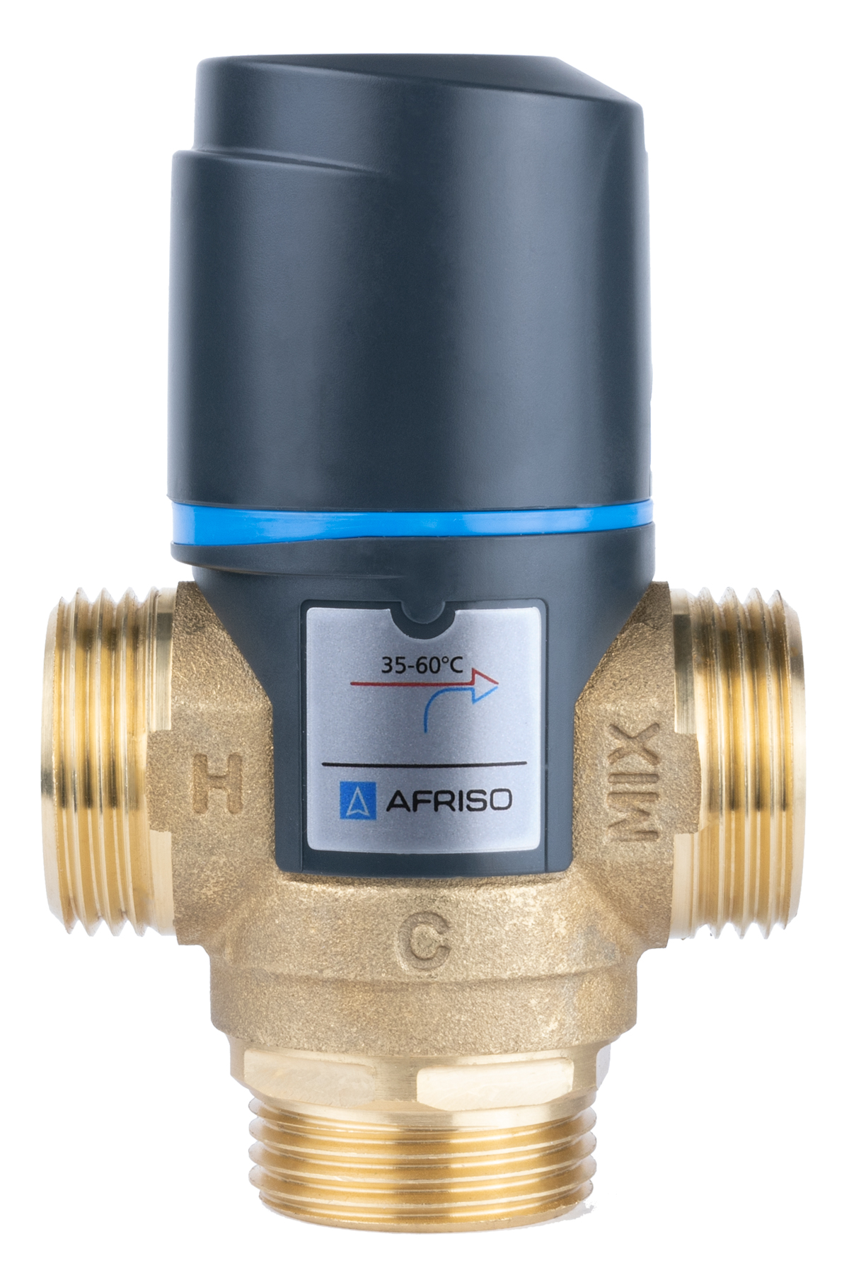 Zawór regulacyjny termostatyczny do wody ciepłej AFRISO ATM 563 ze śrubunkami mosiądz GZ 1'', DN 20, zakres temp. 35-60'C, Kvs 2.5 m3/h, maksymalna temperatura 90'C, maksymane ciśnienie 10 bar