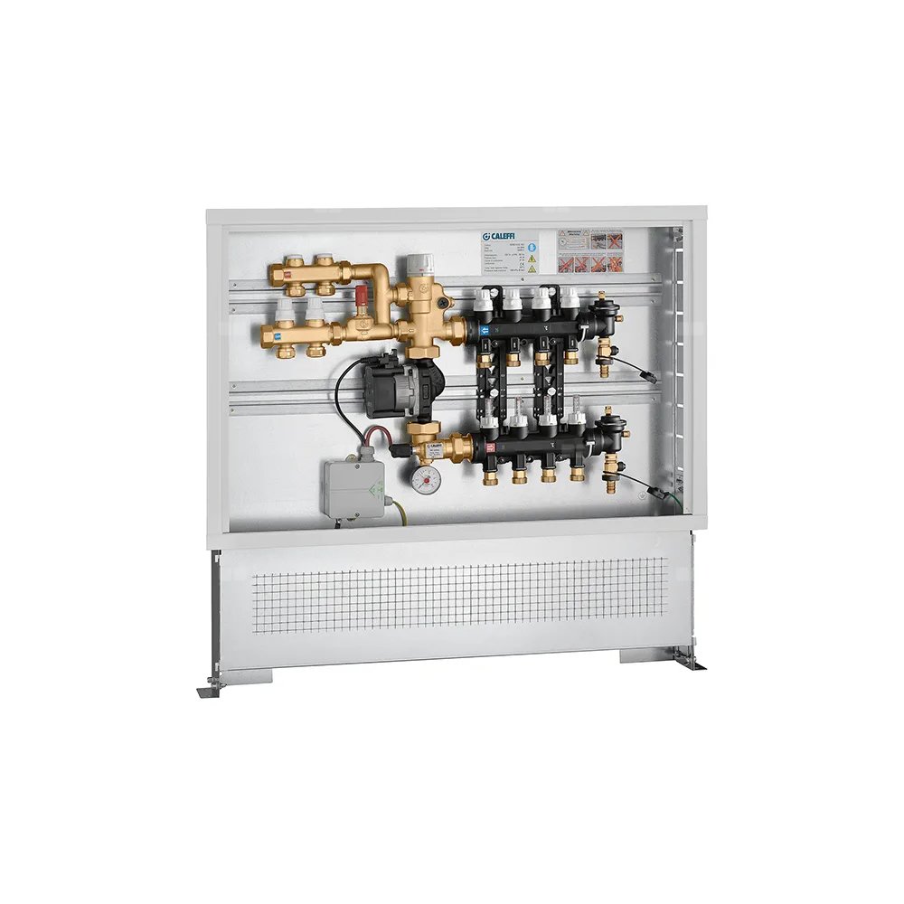 Zespół regulacyjny – regulacja stałotemperaturowa. Wstępnie zmontowany w skrzynce inspekcyjnej. 11 wyjść. Dodatkowy rozdzielacz obiegu pierwotnego z dwoma wyjściami.