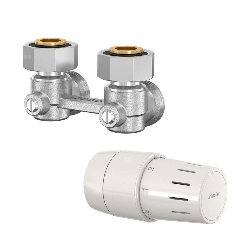 Kompletny zestaw do podłączenia i wyposażenia grzejnika, głowica termostatyczna z przyłączem na zacisk, podejście kątowe.