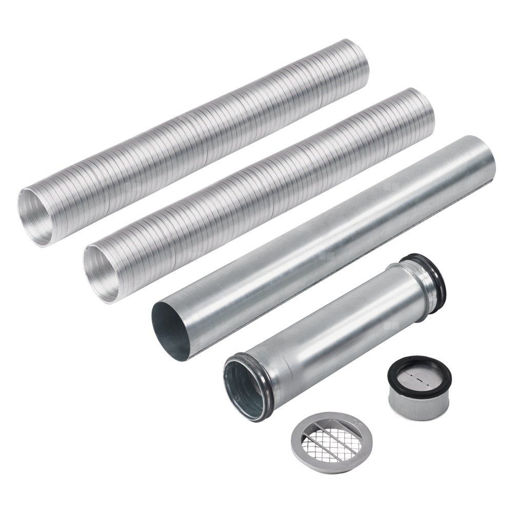 Zestaw osprzętu do wentylacji bezpieczeństwa dla pomp ciepła WPE-I 07.1/12.1 H(W) Plus składający się z wyrzutni ściennej DN 80 do ścian zewnętrznych o grubości do 500mm, klapowego zaworu zwrotnego i dwóch 5-metrowych aluminiowych rur elastycznych DN80.