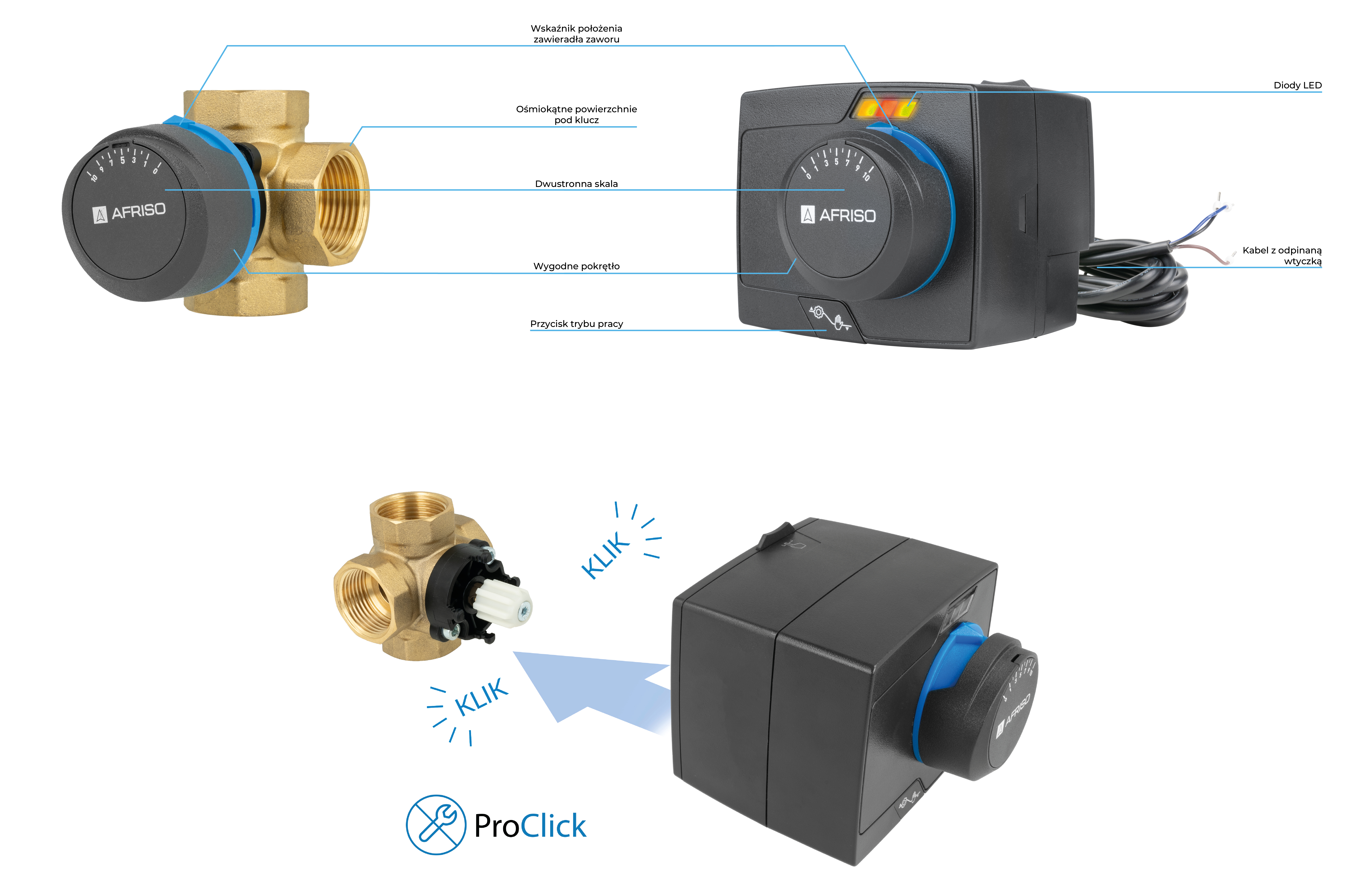 Urządzenia wyposażone w system ProClick – pozwala na bezpośredni montaż siłownika na zaworze bez użycia dodatkowych narzędzi.