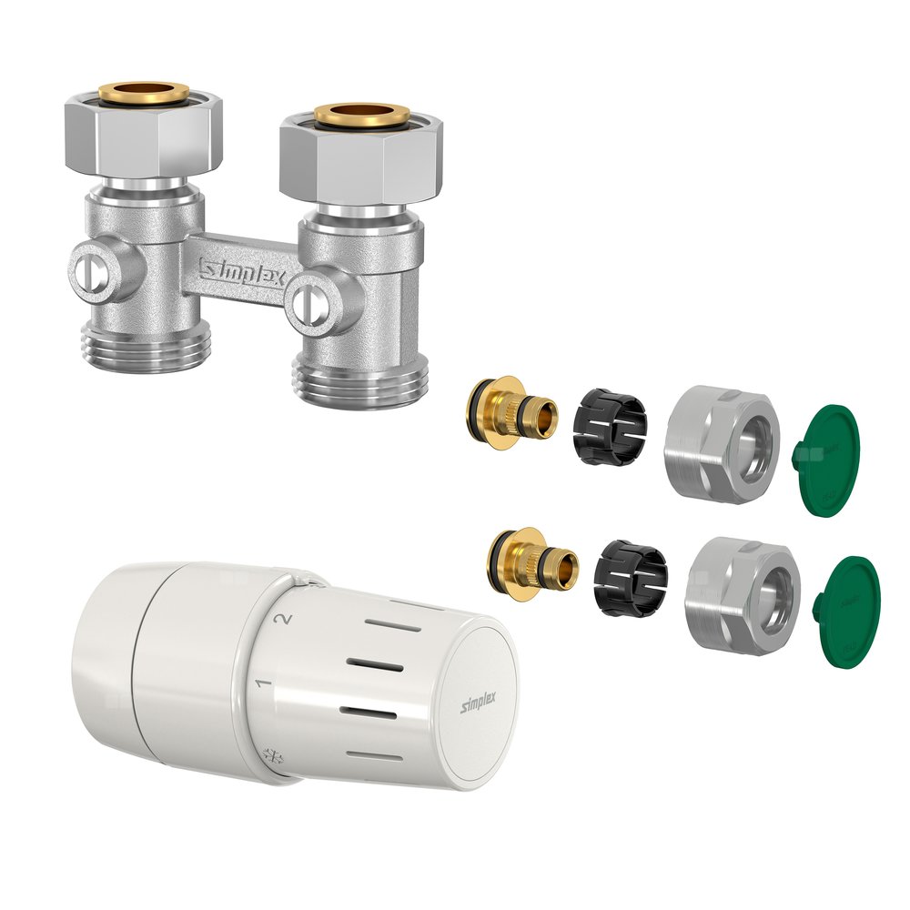 Kompletny zestaw do podłączenia i wyposażenia grzejnika, głowica termostatyczna z przyłączem na zacisk, podejście proste.