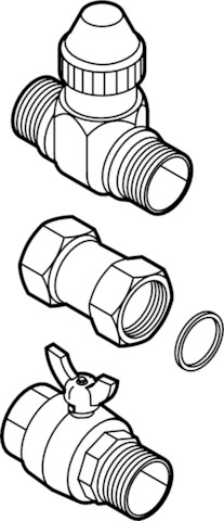Zestaw zaworów strefowych, przejście. Przeznaczenie: ogrzewanie powierzchniowe Fonterra, rozdzielacz obwodów grzejnych DN25. Zastosowanie: siłownik nr wzoru 1249, 1249.1, mosiądz. Wyposażenie: Zawór strefowy z zaślepką ochronną, element dystansowy DN25 z uszczelką, zawór kulowy na powrocie, nr wzoru 1286, nr kat. 610 005, DN: 25